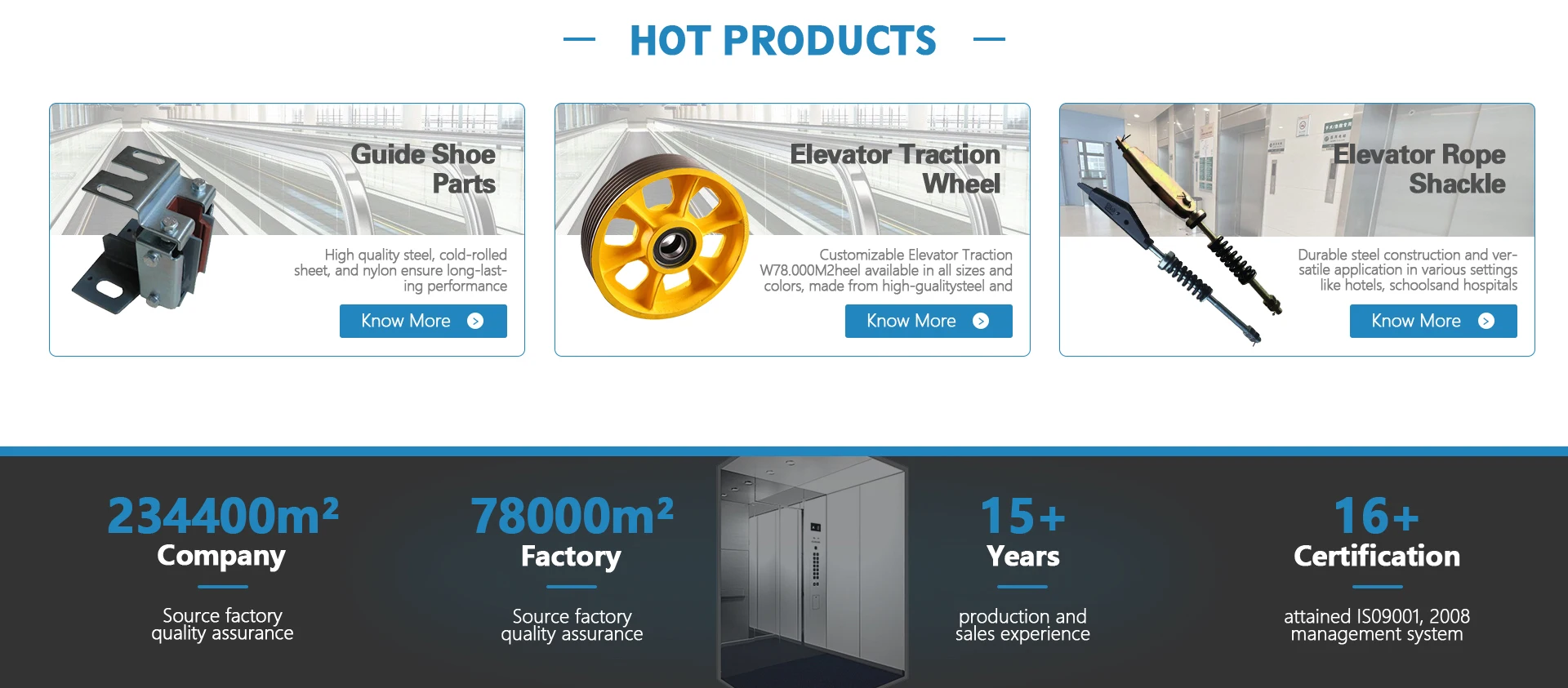 Hauptprodukte:Aufzugs teile, Aufzugs seil befestigung, Aufzugs führungs schuh, Über drehzahl regler, Dämpfung kissen